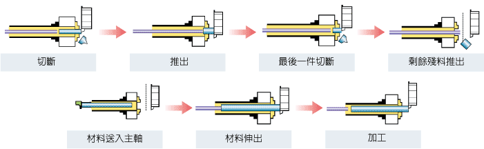 棒材長度限制為主軸+工件長度(工件+夾頭+主軸+油壓缸+主軸后蓋長度)。若棒材延伸長度超過主軸后蓋,則必須使用棒材支撐裝置。否則在加工中可能會導致棒材彎曲,進而導致操作人員受傷等工安意外。